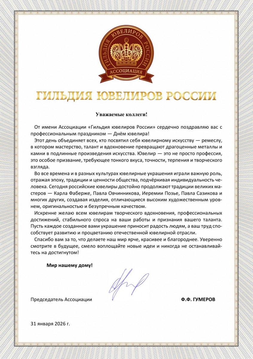 Поздравление с Международным днем ювелира от Председателя Ассоциации Ф.Ф.Гумерова
